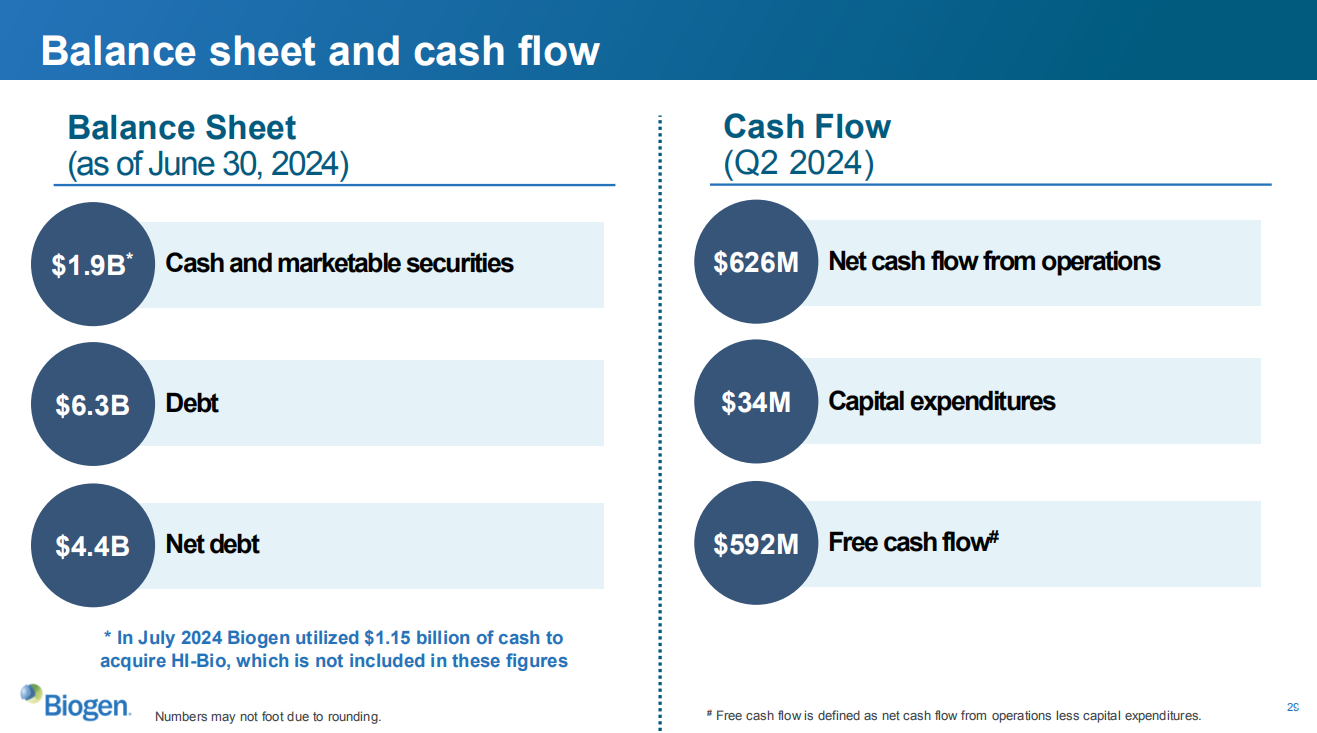 2024年第二季度公司的运营净现金流为6.26亿美元。截至2024年6月30日,Biogen现金、现金等价物和有价证券总额约为19亿美元,债务总额约为63亿美元,净债务约为44亿美元。