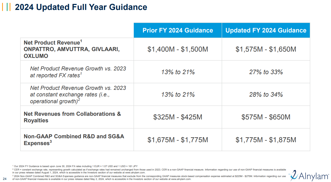 8月1日,全球领先的RNAi治疗公司Alnylam Pharmaceuticals (Nasdaq: ALNY),发布2024年第二季度业绩:2024年上半年总收入11.54亿美元,同比增长80.9%;净产品收入7.75亿美元,同比增长33.2%,这主要得益于AMVUTTRA因患者需求增加而实现的强劲增长,以及使用GIVLAARI和OXLUMO疗法患者人数的增加。其中2024 Q2总收入6.6亿美元,同比增长107%;净产品收入4.1亿美元,同比增长34.1%。