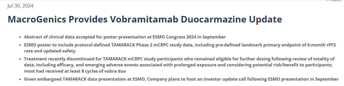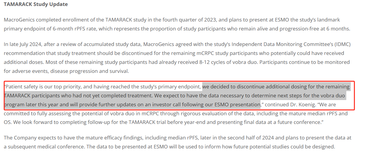 根据官网TAMARACK研究更新,Macrogenics接受独立数据监测委员会(IDMC)的建议对于未完成给药周期的患者,不再继续给药。Macrogenics希望在收集必要的数据之后再做下一步的决定,并将在ESMO演讲后的投资者电话会议上提供进一步的更新。