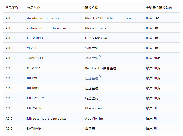 据不完全统计,目前,临床上B7-H3 ADC药物共计12款,其中处于临床III期的有1款,临床II期的有3款,剩下的除了3款处于临床I期,其余的均处于临床I/II期。