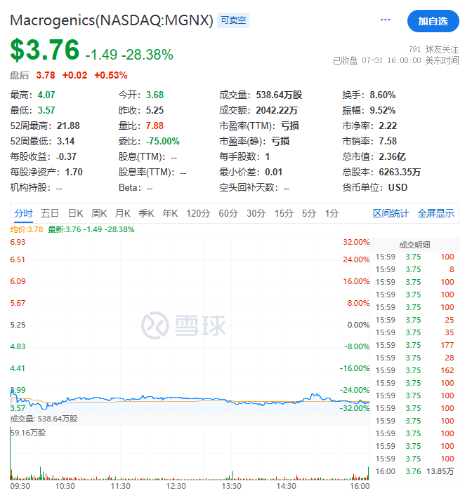 受此消息的影响,Macrogenics的股价当天下跌超28%,目前市值2.36亿美元。今年5月10日,公司也经历了一次股价超77%的大跌,原因是vobra duo在治疗前列腺癌二期临床Tamarack试验中,有5名患者死亡,另外还有过半患者出现3级或以上的不良事件发生,当时的股价也吐回到过去一年的涨幅。