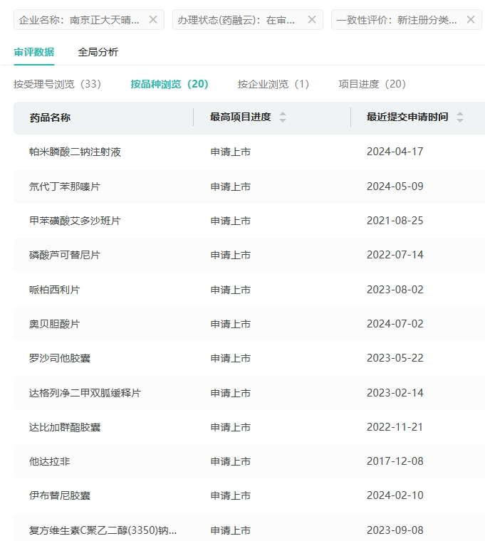 据药融云数据库显示,南京正大天晴制药共有苯磺酸美洛加巴林片、奥贝胆酸片、他达拉非、磷酸芦可替尼片等20个品种提交了仿制药上市申请,均在审评审批中。