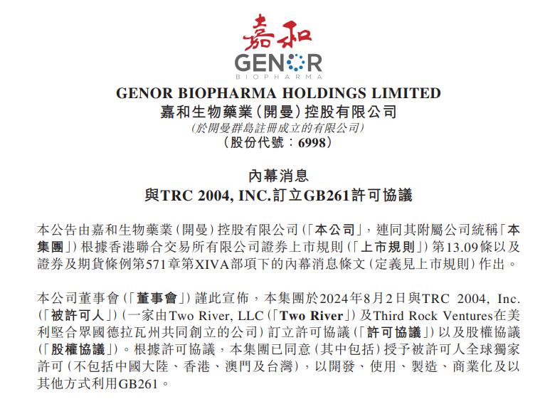 8月5日,嘉和生物发布公告:与TRC 2004(一家由Two River及Third Rock Ventures共同创立的公司)订立许可协议以及股权协议。根据许可协议,嘉和生物已同意(其中包括)授予被许可人全球独家许可(不包括中国大陆、香港、澳门及台湾),以开发、使用、制造、商业化及以其他方式利用GB261。