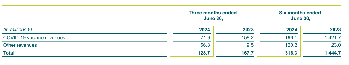 截至2024年6月30日,现金和现金等量物加上证券投资达到184.851亿欧元(1,449亿人民币),其中包括103.767亿欧元现金和现金等价物。这一部分的增加,主要是因为公司从合作伙伴辉瑞处获得了现金支付。