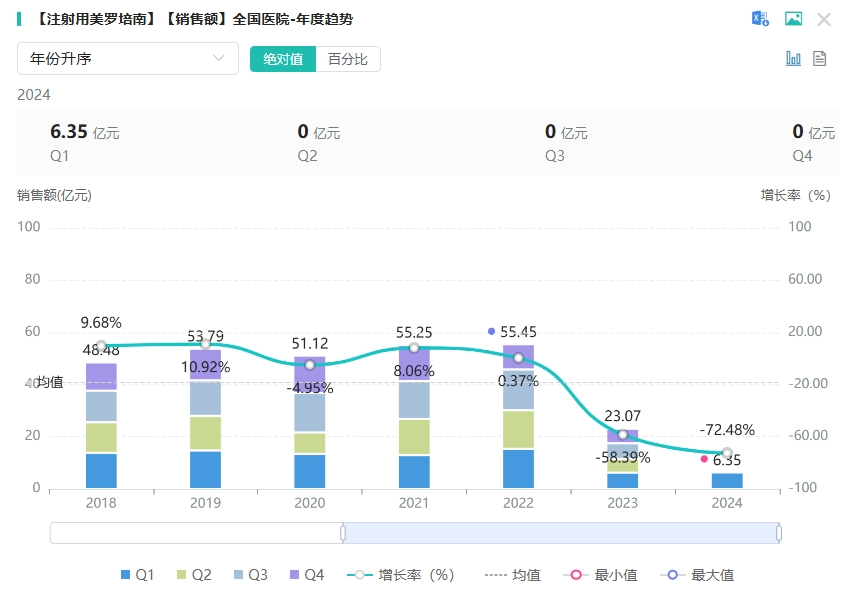 注射用美罗培南是第二代广谱碳青霉烯类抗生素,对需氧或厌氧的革兰阳性菌、革兰阴性菌包括多重耐药菌及铜绿假单胞菌均有强大的抗菌作用。临床上适用于成人和儿童由单一或多种对美罗培南敏感的细菌引起的感染1,如肺炎(包括院内获得性肺炎)、尿路感染、腹腔内感染、妇科感染(如子宫内膜炎和盆腔炎)、皮肤软组织感染、脑膜炎、败血症等。据药融云数据库显示,注射用美罗培南在2023年全国院内市场销售额超23亿元。