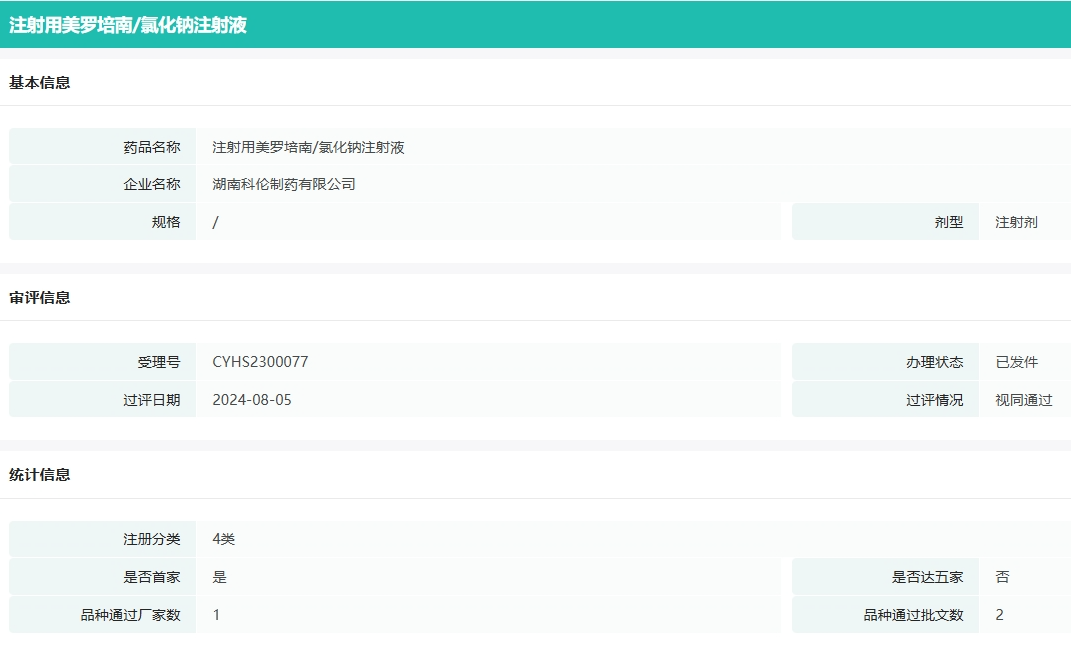 8月5日,据NMPA官网公示,湖南科伦制药提交的注射用美罗培南/氯化钠注射液(规格:0.5g/100ml、1.0g/100ml)获批上市并视同通过一致性评价。该品种是国内首个获批上市的碳青霉烯类粉液双室袋制剂。