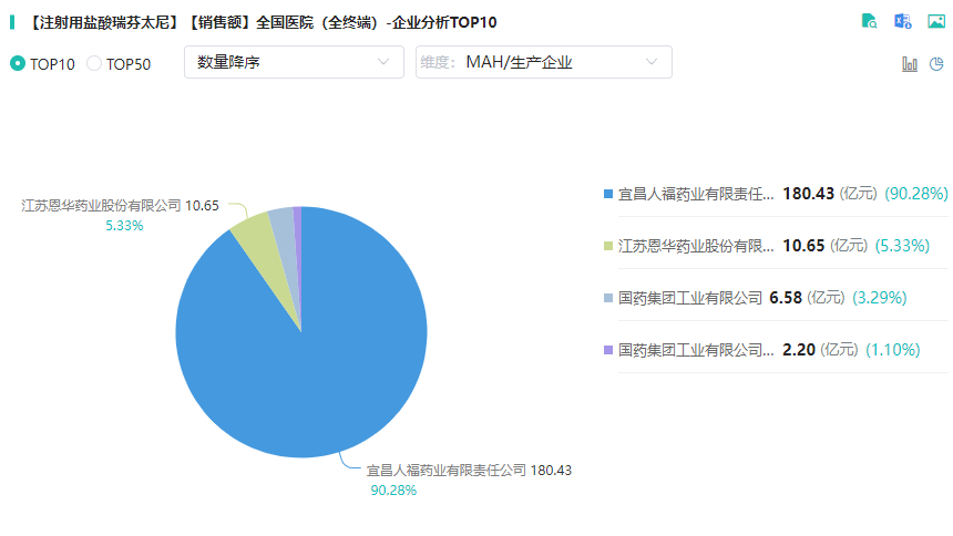 宜昌人福的注射用盐酸瑞芬太尼于2003年获批上市,适应症为“全麻诱导和全麻中维持镇痛”。后又于2024年2月获批“重症监护患者机械通气时的镇痛”新适应症。药融云数据库显示,目前国内有3家企业拥有注射用盐酸瑞芬太尼生产批文,分别是宜昌人福药业、恩华药业、国药集团,其中宜昌人福在医院终端的市场份额最大,占比90.28%。