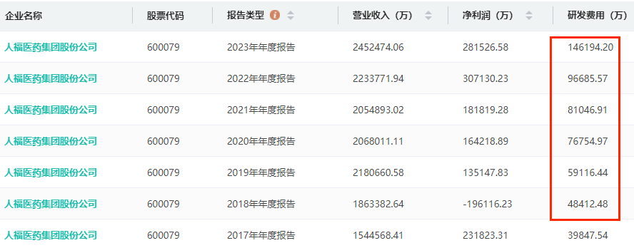 人福医药历年研发费用查询