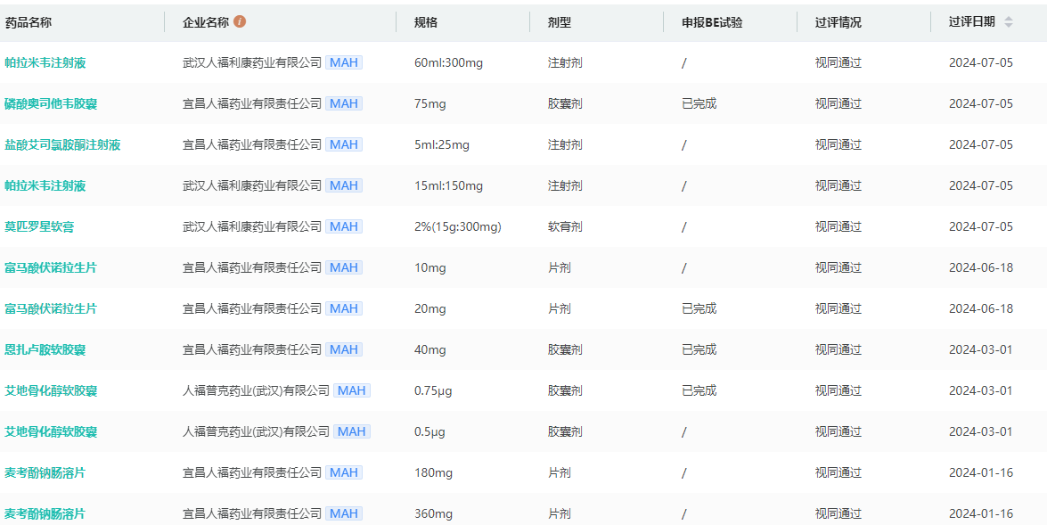 人福医药2024年过评药品信息查询