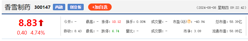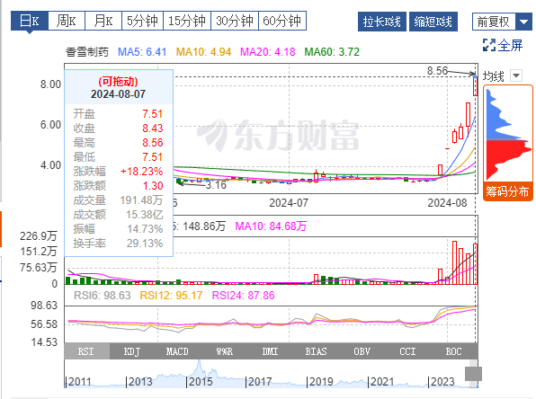 8月7日,香雪制药收盘上涨18.23%,报8.43元/股,盘中最高触及8.56元,股价创一年新高。至此,该股近6个交易日累计大涨超150%。