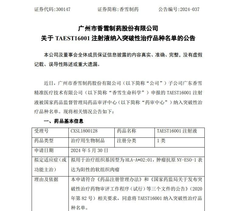 近日,中国国家药品监督管理局 (NMPA) 药品审评中心(CDE)同意广州市香雪制药股份有限公司子公司香雪生命科学(XLifeSc)的TAEST16001注射液纳入突破性治疗品种名单,标志着该产品作为中国第一个IND获批开展临床试验的TCR-T细胞治疗新药取得重大突破,可加快关键性临床试验和附条件批准上市的进程,有望成为中国第一款上市的TCR-T细胞治疗药物,对中国免疫细胞治疗创新药的发展具有里程碑的意义。