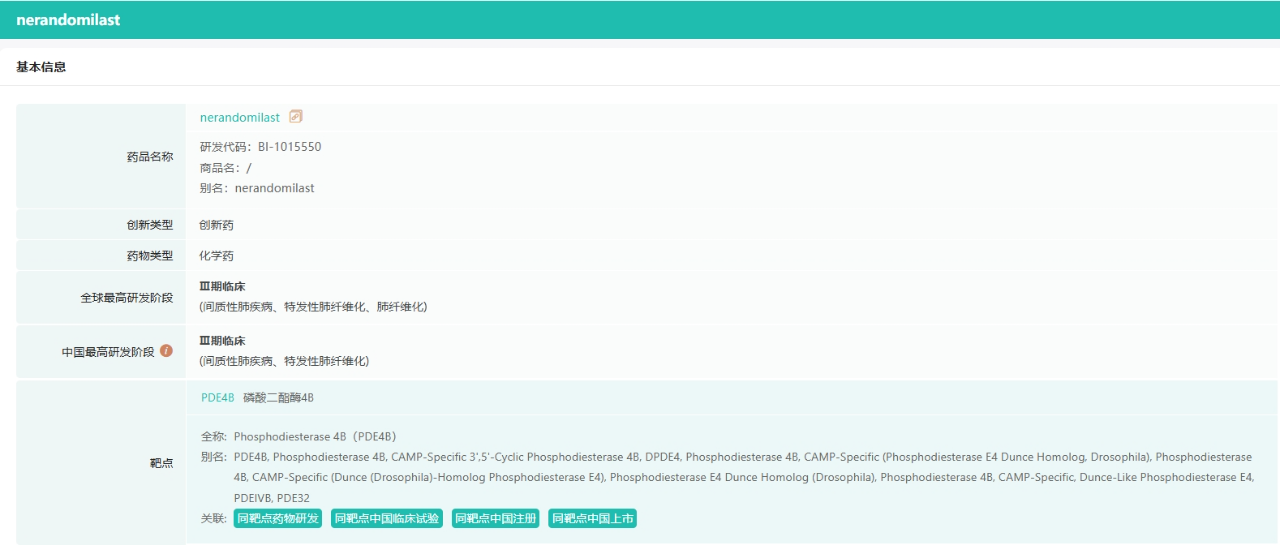 据药融云全球药物研发数据库显示,目前国内外尚无同靶点药物上市,同靶点PDE4B的口服在研新药中,勃林格殷格翰开发的nerandomilast(BI-1015550)正处于III期临床,适应症包括特发性肺纤维化、间质性肺疾病。
