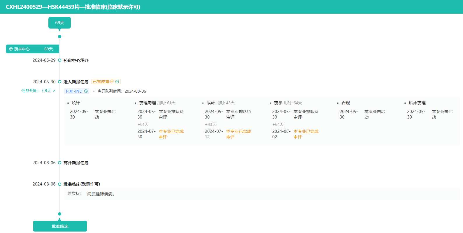 8月8日,据海思科医药集团发布公告称,其控股子公司四川海思科制药申报的1类新药HSK44459片获得临床试验默示许可,拟用于治疗间质性肺疾病。