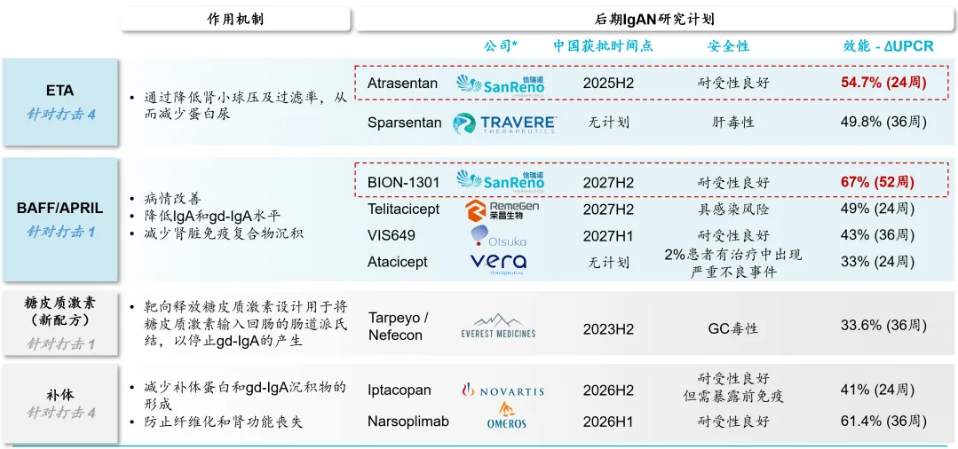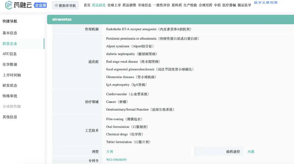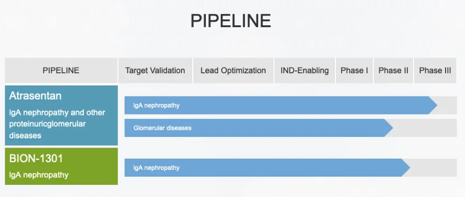 Atrasentan是一种强效高选择性(Ki=0.034nM)内皮素A(ETA)受体拮抗剂,可选择性阻断ETA受体,通过阻断肾小球系膜细胞活化,直接的抗炎和抗纤维化,降低球囊内压力和肾小球滤过屏障大分子的通透性来减少 IgAN 患者的尿蛋白。本品最早由雅培制药开发,相关专利WO-09606095;后转让予Chinook;现不同地区权益归属于诺华和信瑞诺。