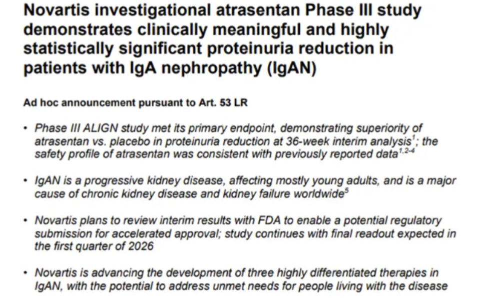 2023年10月30日,诺华/Chinook披露了atrasentan治疗IgA肾病的III期ALIGN临床研究36周期中分析取得了积极结果。