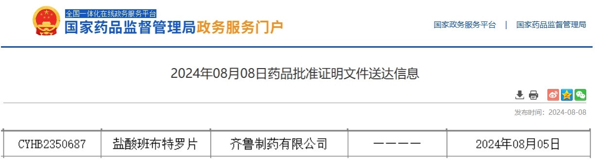 8月8日,据NMPA官网公示,齐鲁制药提交的仿制药盐酸班布特罗片通过一致性评价。2024年至今,齐鲁有8款品种迎首家过评。