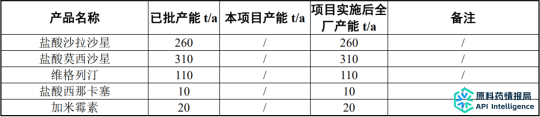 建设内容:本次项目改造利用公司6号、8号厂区厂房,并拆除6号厂区回收车间、食堂,新建厂房、污水处理站等建构筑物,购置反应釜、三合一、精馏塔等设备,形成年产5362吨原料药(700吨罗红霉素(新增280吨)、1200吨阿奇霉素(新增450吨)、2000吨恩诺沙星(新增600吨)、1200吨盐酸恩诺沙星(新增550吨)、10吨托匹司他(新增)、2吨去氧氟尿苷(不变)、200吨碳酸镧(不变)、50吨柠檬酸铁水合物(不变))、2085吨中间体(576吨二氢高红霉素(新增276吨)、400吨M3(新增400吨)、1109吨L2(不变))的生产规模,年副产硫酸铵400吨。其中去氧氟脲苷、碳酸镧、柠檬酸铁水合物于二期进行建设。