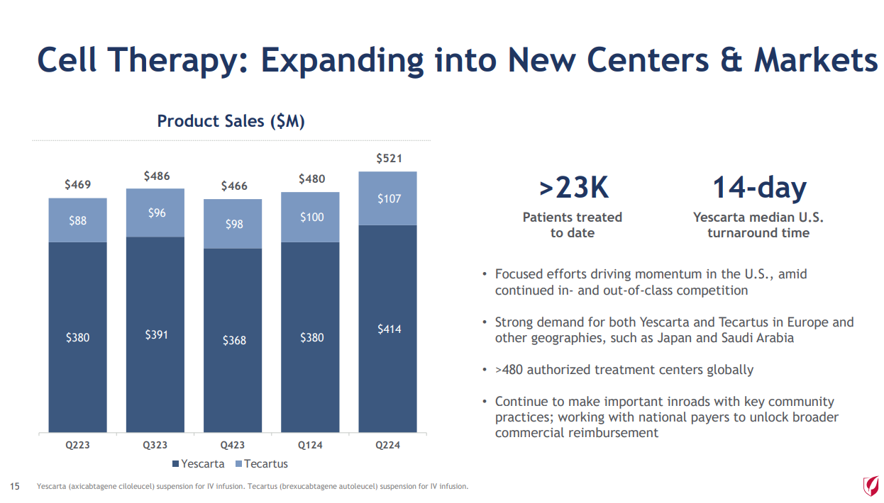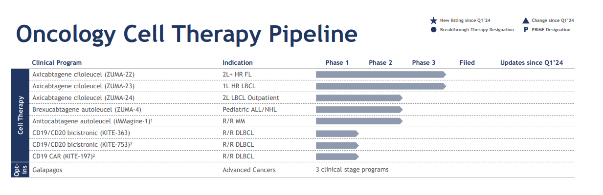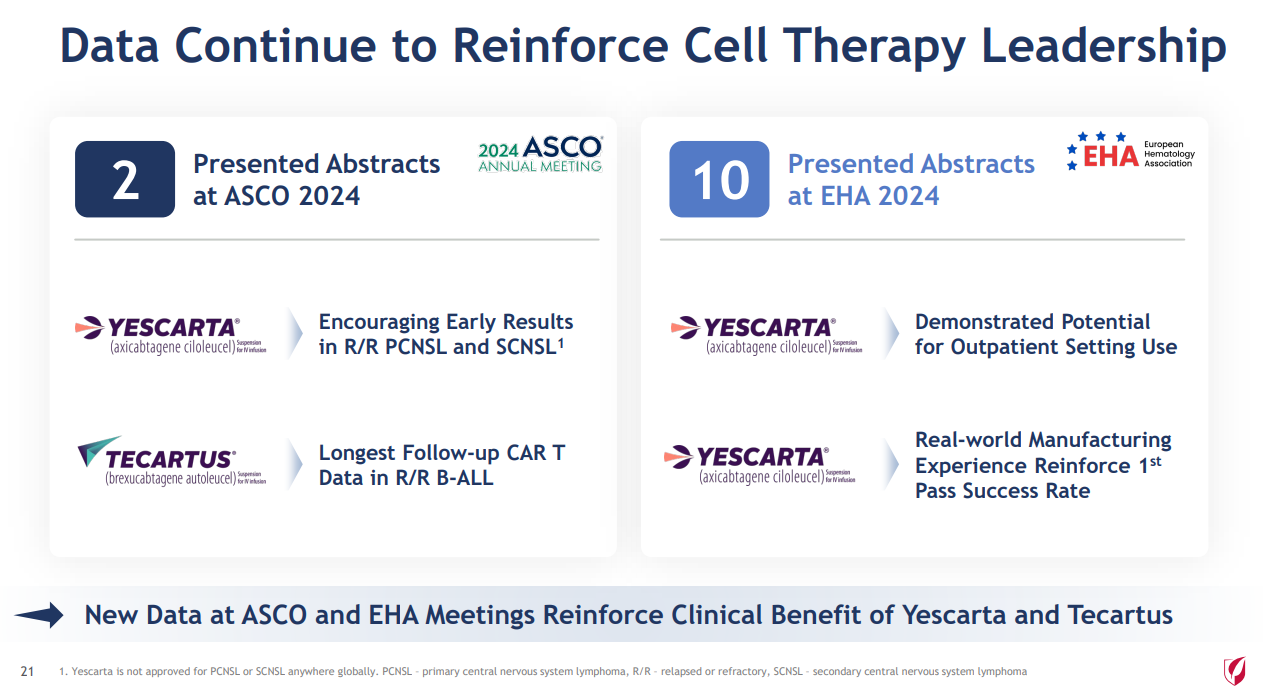 细胞疗法方面,两款CAR-T产品Yescarta®和Tecartus®2024 H1销售额共计10.01亿美元(约72亿元);2024 Q2销售额共计5.21亿美元(约37亿元),与2023年同期相比增长11%。
