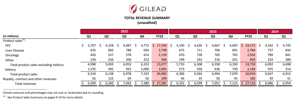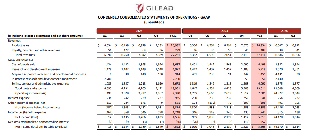近日,吉利德发布了2024年第二季度业绩:2024上半年总营收136.4亿美元,同比增长5%;2024 Q2总营收69.54亿美元,与去年同期相比增长5%,这主要是由于HIV、肿瘤和肝病药物的销售额增长。研发投入13.51亿美元,同比下降4%。