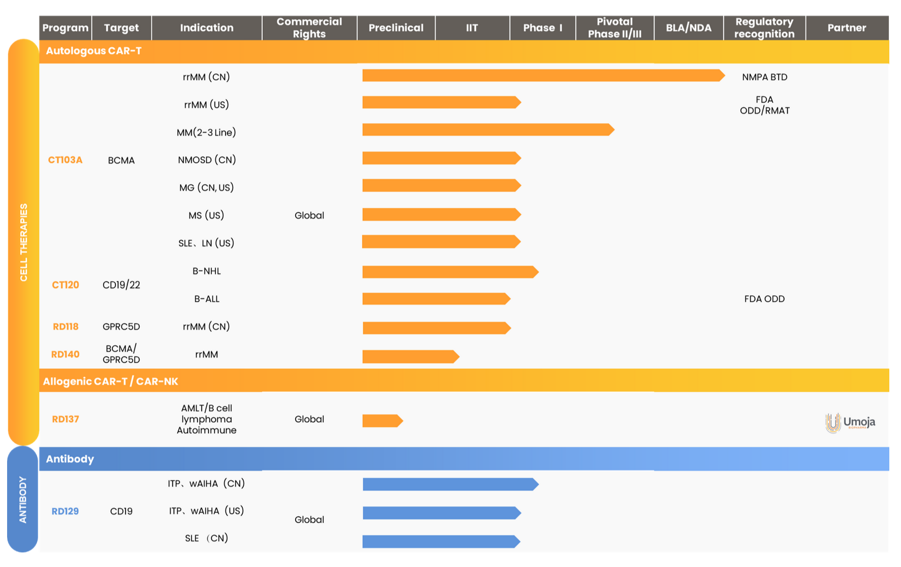 截至目前,伊基奥仑赛注射液在自身免疫疾病适应症中已获得美国FDA 3项IND许可,分别针对重症肌无力(MG)、多发性硬化症(MS)以及此次SLE和LN的治疗。在中国,该产品在自身免疫性疾病适应症中也已获得国家药品监督管理局(NMPA)2项IND默示许可,分别针对视神经脊髓炎谱系疾病(NMOSD)和MG的治疗。同时,伊基奥仑赛注射液(福可苏®)已经于2023年6月获得国家药品监督管理局批准用于治疗既往经过至少3线治疗后进展(至少使用过一种蛋白酶体抑制剂及免疫调节剂)的复发难治多发性骨髓瘤成人患者。