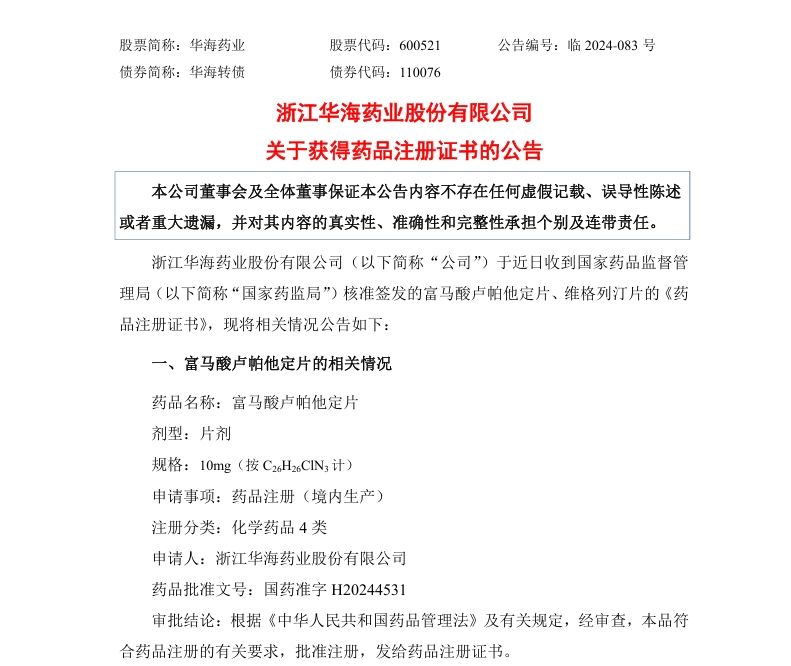今年以来,华海药业已有富马酸卢帕他定片、富马酸喹硫平片、托拉塞米片、注射用盐酸表柔比星等16款产品获批,涵盖呼吸系统药物、神经系统药物、心血管系统药物、消化系统与代谢药物等多个领域。