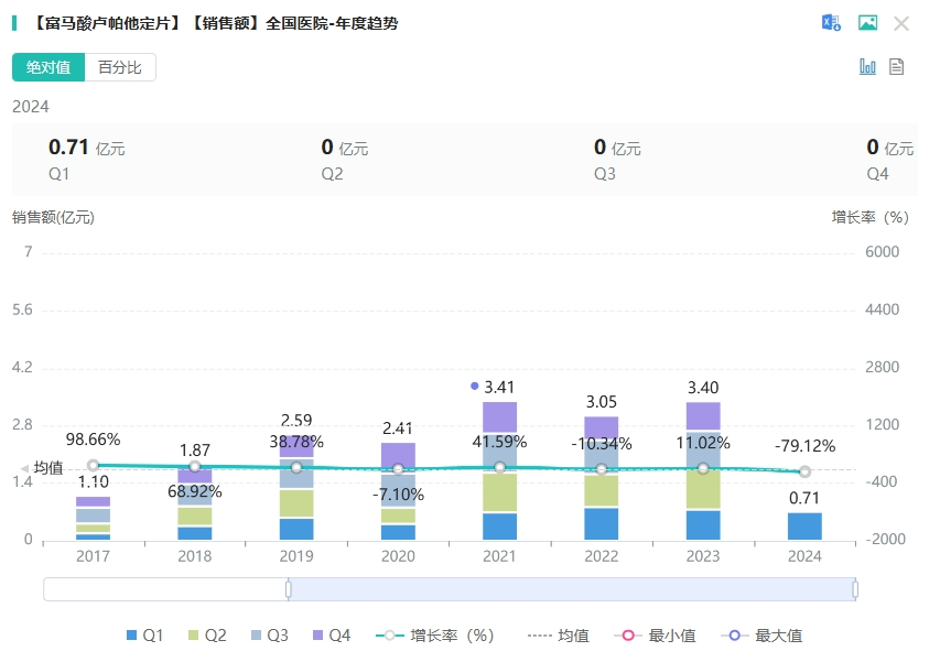 富马酸卢帕他定片最早由J. Uriach y Compañía, S.A.研发。为第二代抗组胺药物,是一种长效、选择性外周H1受体拮抗剂。用于成年人和青少年(大于12岁)过敏性鼻炎和荨麻疹的 对症治疗。据药融云数据库显示,2023年富马酸卢帕他定片在全国院内市场的销售额达3.4亿元,同比增长达11.02%。