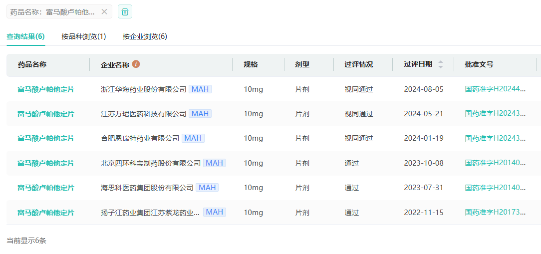 目前,富马酸卢帕他定片有8家药企拥有生产批文,浙江华海药业、北京四环科宝制药、合肥恩瑞特药业、扬子江药业集团等6家国内药企均已过评。