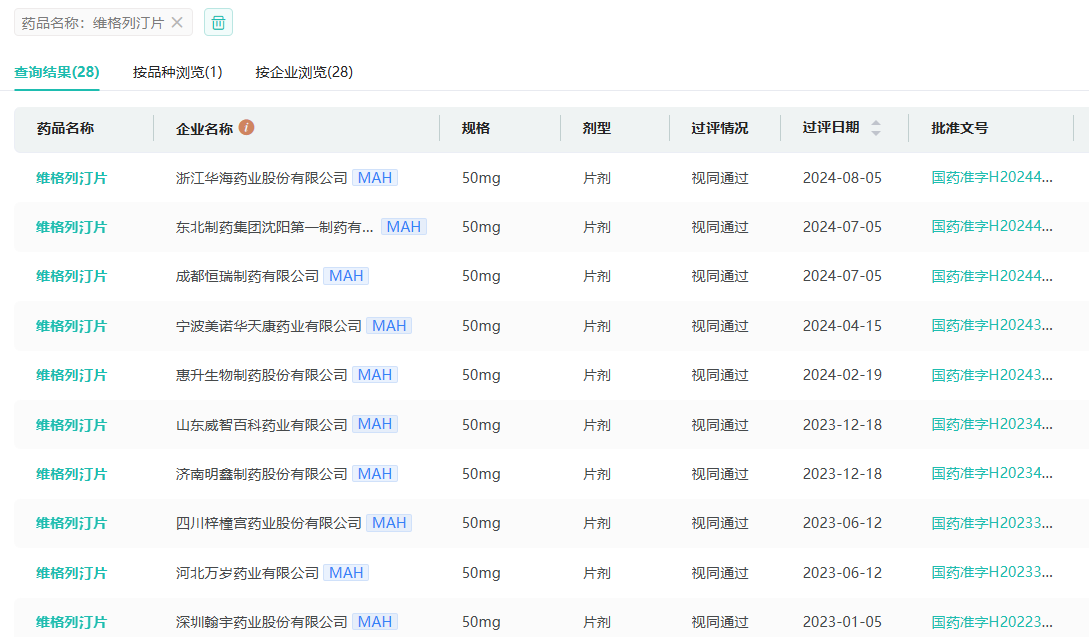 目前,维格列汀片有29家药企拥有生产批文,浙江华海药业、成都恒瑞制药、齐鲁制药、仁合益康集团等28家国内药企均已过评。