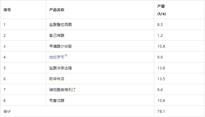 建设规模:项目建成后年产琥珀酸曲格列汀9.6t/a、甲磺酸沙非胺10.8t/a、盐酸鲁拉西酮8.5t/a、司替戊醇10.8t/a、氨己烯酸1.2t/a、地拉罗司9.9t/a、盐酸决奈达隆13.8t/a、吲哚布芬13.5t/a,合计产能78.1t/a。