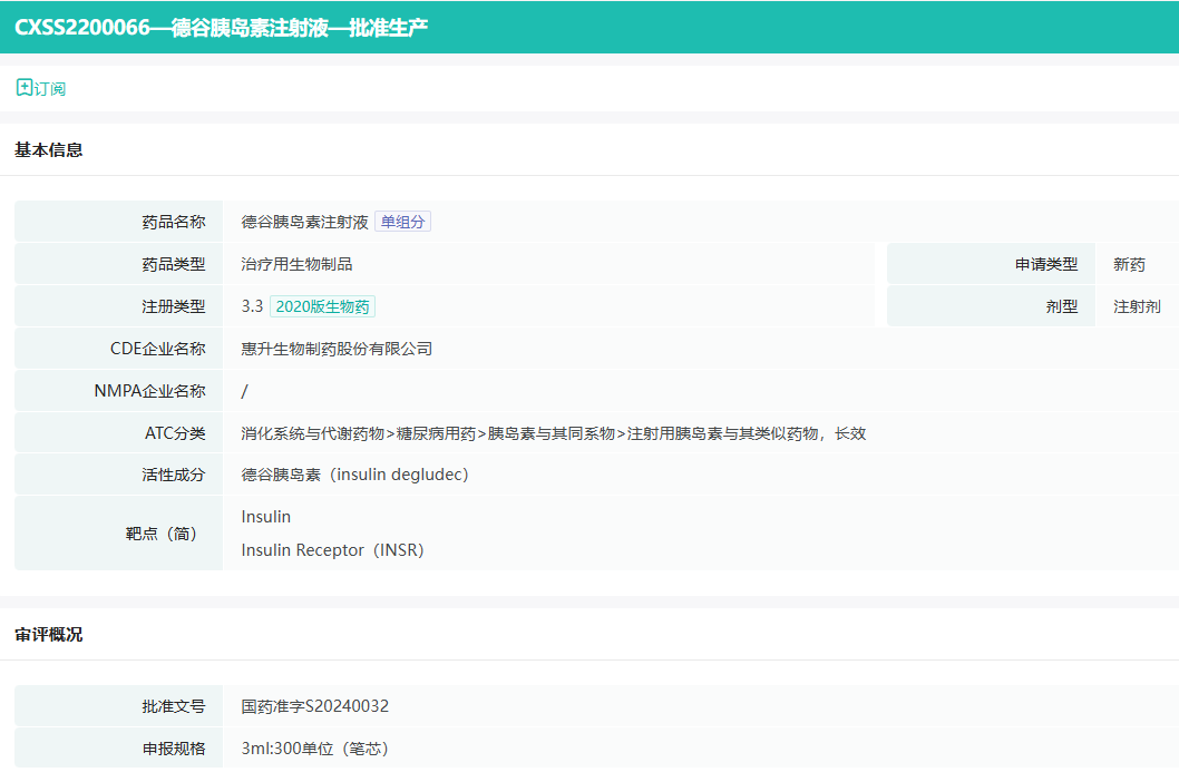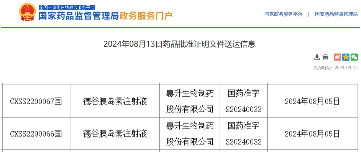8月13日,据NMPA网站显示,四环医药旗下惠升生物开发的第四代胰岛素类似物德谷胰岛素注射液获批上市,成为国产首个获批的德谷胰岛素生物类似物。