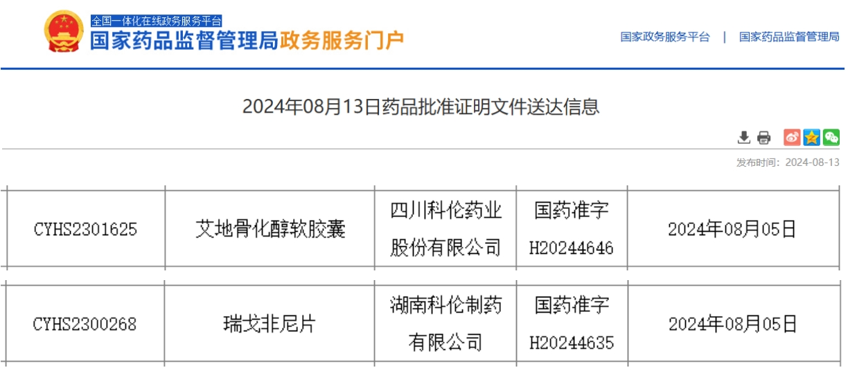 8月13日,据NMPA官网公示,四川科伦药业以仿制药4类报产的艾地骨化醇软胶囊和湖南科伦制药以仿制药4类报产的瑞戈非尼片两大品种同日获批。据药融云数据库显示,今年以来,科伦药业(含子公司)有20个品种过评,其中斩获3款首仿。