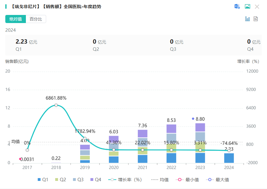 瑞戈非尼片最早由拜耳研发,是一种抗癌药,属于多靶点的、细胞内激酶的小分子抑制剂,通过作用于肿瘤细胞、内皮细胞和外周细胞的多个激酶,从而抑制肿瘤形成、血管新生和肿瘤微环境形成,参与正常细胞功能及病理过程。于2012年9月获得FDA批准上市,2016年底获批进入国内市场。据药融云数据库显示,瑞戈非尼片在2023年全国院内市场的销售额超8亿元,同比增长达3.31%,市场潜力较大。