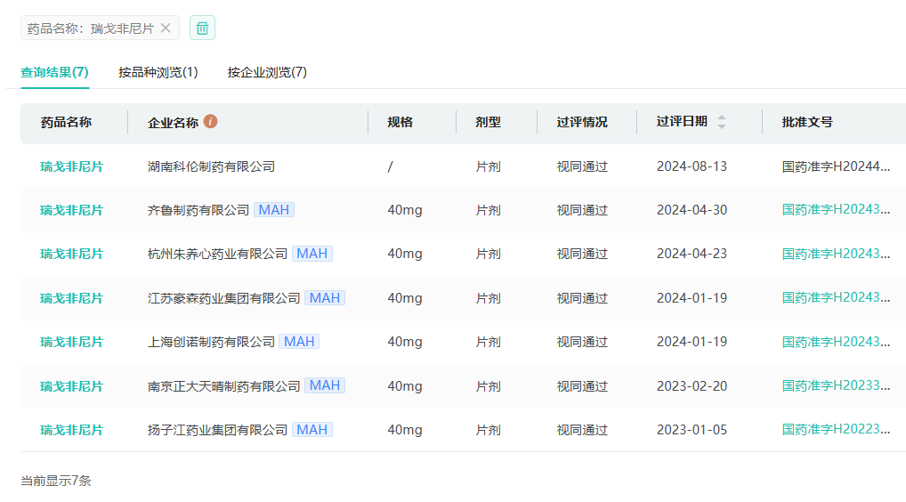 截至目前,瑞戈非尼片有8家药企拥有生产批文,湖南科伦制药、齐鲁制药、南京正大天晴制药等7家国内药企均已过评。