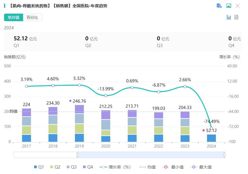 艾地骨化醇软胶囊原研来自中外制药株式会社,用于治疗骨质疏松症,作为国际公认的最新一代活性维生素D类似物,相较骨化三醇、α-骨化醇能为骨质疏松患者治疗带来更精准、优效的解决方案。原研的艾地骨化醇软胶囊于2020年进入国内市场,2022年以后国产仿制药陆续上市,加剧了市场竞争。据药融云数据库显示,2023年肌肉-骨骼系统药物(化药或生物药)在全国院内销售额超200亿元。