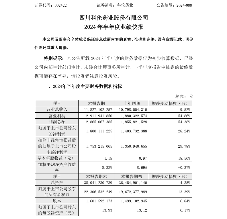 值得注意的是,8月13日,科伦药业发布2024年半年度业绩快报,营收118.27亿元,同比增长9.52%,净利润18.00亿元,同比增长28.24%,再创新高。