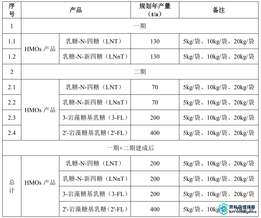 建设规模及分期:本项目预计建设分为两期建设,其中:项目一期工程设计生产规模为260t/a(乳糖-N-四糖(LNT)130t/a、乳糖-N-新四糖(LNnT)130ta)项目二期工程设计生产规模为740t/a(乳糖-N-四糖(LNT)70ta、乳糖-N-新四糖(LNnT)70ta、3-岩藻糖基乳糖(3-FL)200t/a、2-岩藻糖基乳糖(2'-FL)400t/a)。一期工程+期工程的总设计生产规模为1000t/a。