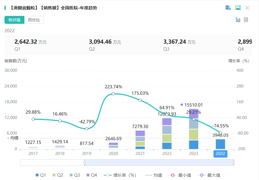 滑膜炎颗粒是神威药业的独家创新型中成药,具有清热祛湿、活血通络的功效,主治骨关节炎、类风湿关节炎、运动性损伤关节炎、痛风性关节炎、骨关节术后恢复等其他等骨关节相关疾病。据药融云数据库显示,滑膜炎颗粒在2023年全国院内市场的销售超1亿元,同比增长达29.21%。