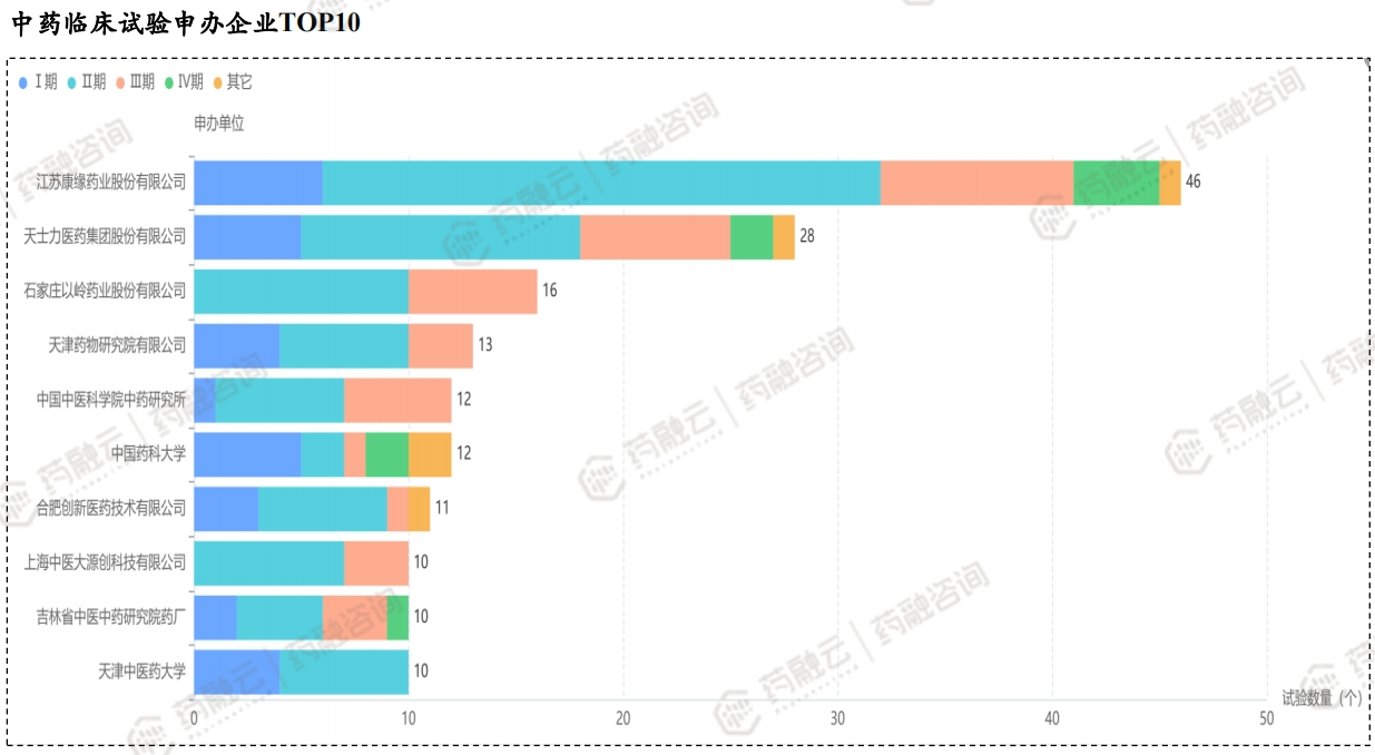 从企业层面来看,其中江苏康缘药业、河南省洛正药业、神威药业3家药企均拟入2个独家品种。特别值得一提的是,江苏康缘药业在中药临床试验领域更是领跑行业药企,其开展的中药临床试验数量高达46项,其中Ⅰ期有6项,Ⅱ期有26项,Ⅲ期有9项。在中药临床试验领域,排名前三的申办企业分别为康缘药业、天士力、以岭药业。