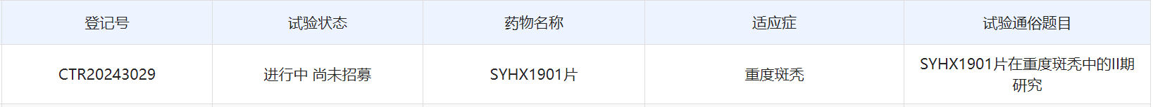 8月14日,据中国药物临床试验登记与信息公示平台官网公示,石药集团启动了一项2期临床研究,旨在评价SYHX1901片在重度斑秃患者中的有效性和安全性。