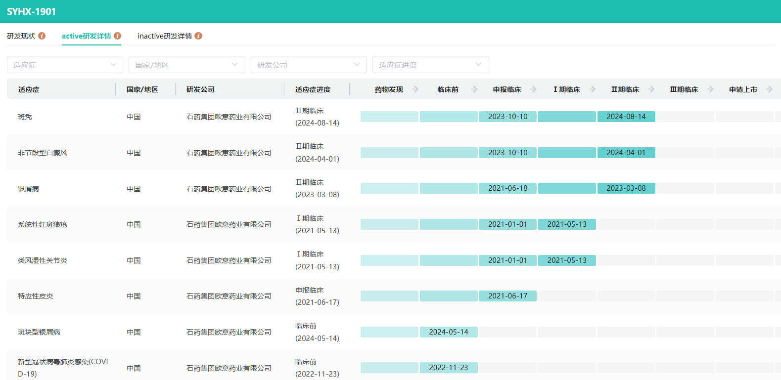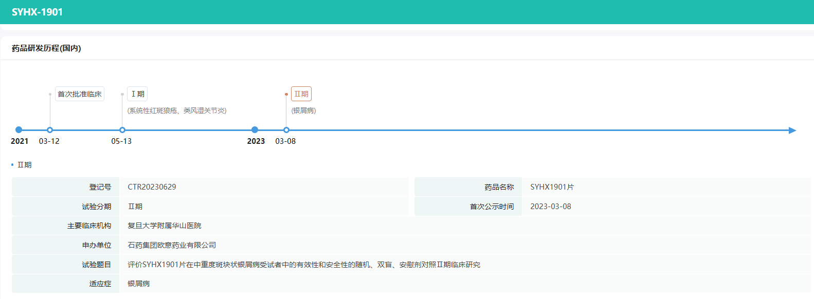 SYHX1901片是石药集团开发的JAK/SyK双靶点抑制剂,拟开发治疗多种自身免疫相关性疾病。该在研药对JAK激酶和SyK激酶各亚型均有较强的抑制活性。此前,石药集团已经启动了该产品针对银屑病、非节段型白癜风的2期临床研究,以及针对系统性红斑狼疮、类风湿关节炎适应症的1期临床研究。
