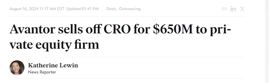 近日,据外媒报道,生物制药公司Avantor Inc. 以6.5亿美元(46亿元人民币)的价格将CRO业务出售给私募股权公司Audax Private Equity。这笔交易预计将在今年第四季度完成。