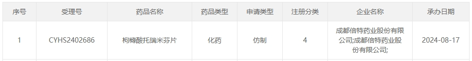 8月17日,据CDE官网显示,成都倍特药业提交的4类仿制药枸橼酸托瑞米芬片上市申请已获受理(受理号CYHS2402686)。据药融云数据库显示,该品种在2023年全国院内市场的销售额达3.28亿元。