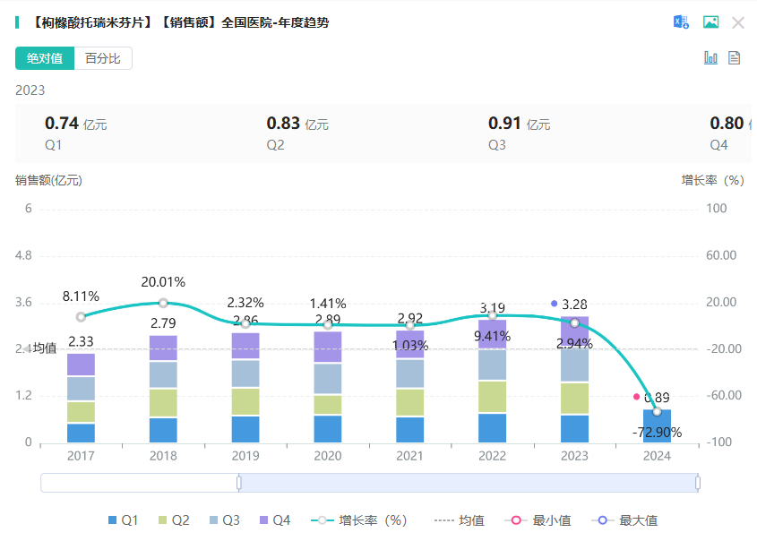 枸橼酸托瑞米芬片由日本KYOWA KIRIN公司研发,商品名为法乐通® (FARESTON®),是一种非类固醇三苯乙烯衍生物,可与雌激素竞争性的与雌激素受体结合从而阻止癌细胞的增殖,适用于治疗绝经后妇女雌激素受体阳性或不详的转移性乳腺癌,属于国家医保乙类品种。1997年6月于美国上市,2018年7月国家药监局批准芬兰Orion Corporation公司药物FARESTON®进口注册上市。据药融云数据库显示,枸橼酸托瑞米芬片在2023年全国院内市场的销售额达3.28亿元,同比增长达2.94%。
