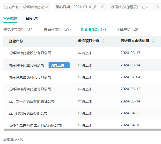 2024年至今,成都倍特药业(含子公司)有26个品种过评,其中注射用头孢唑肟钠、呋塞米口服溶液、钆贝葡胺注射液3个品种为首家过评。