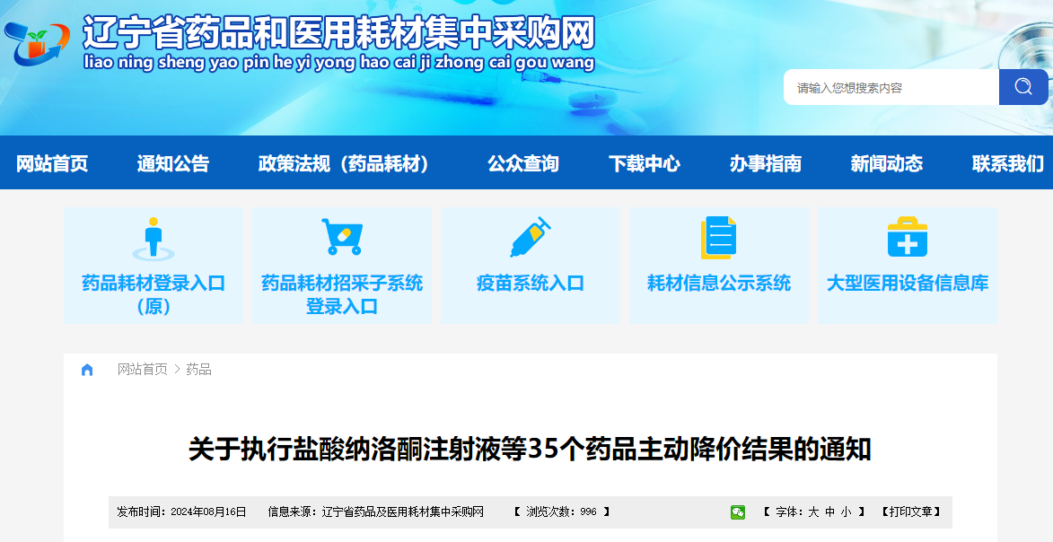 8月16日,辽宁省药品集中采购网又发布一则药品降价通知,于08月21日起执行新的挂网采购价格。本次共有35个药品主动调价,降价产品设置采购过渡期,时间为1周。