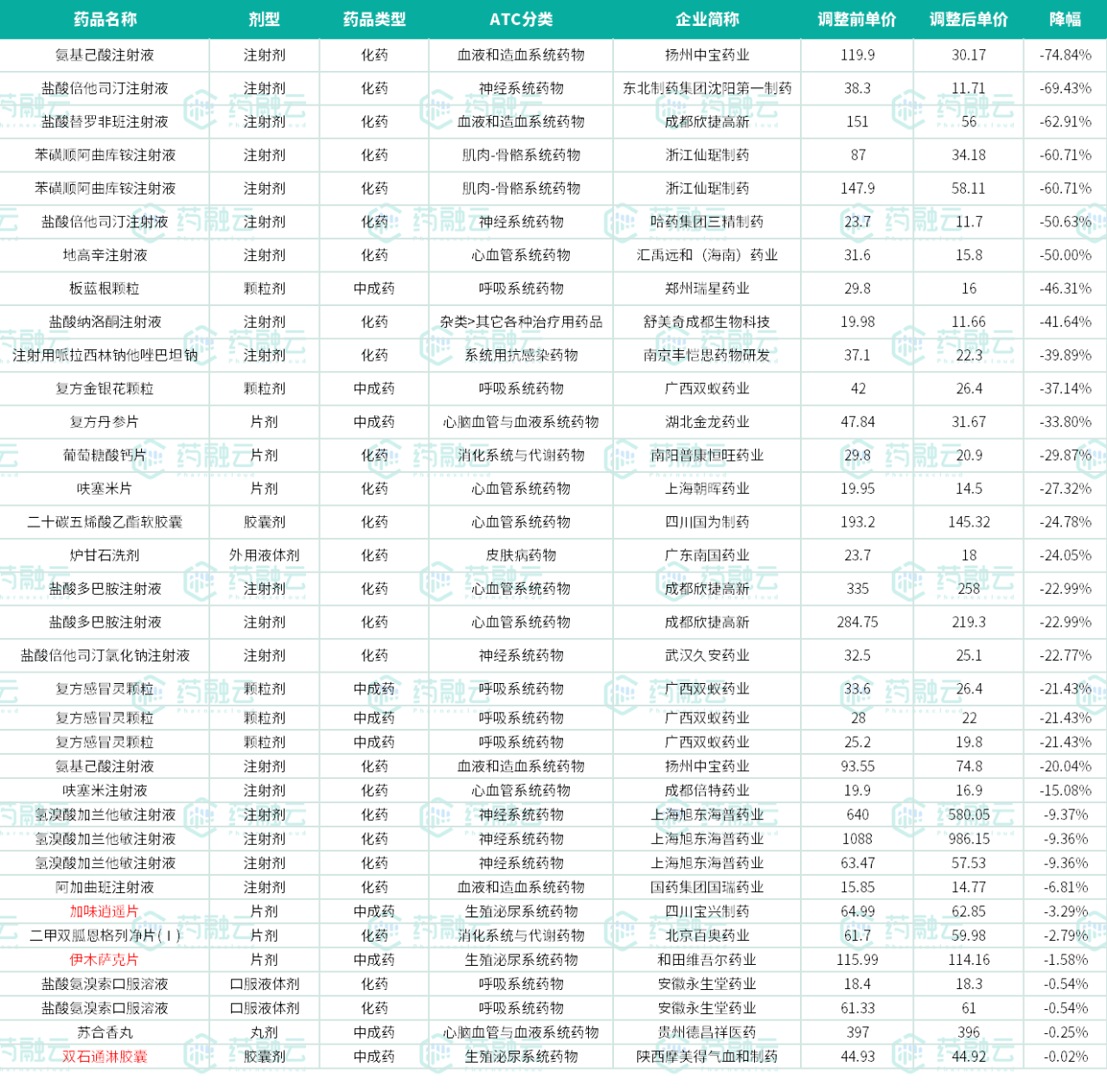 从降价幅度来看,其中,氨基己酸注射液由119.9元下降至30.17元,降幅74.84%,是本次降幅最大的药品。此外,双石通淋胶囊由44.93元下降至44.92元,降幅0.02%,是本次降幅最小的药品。