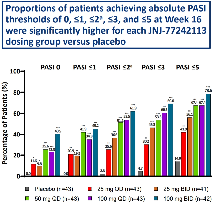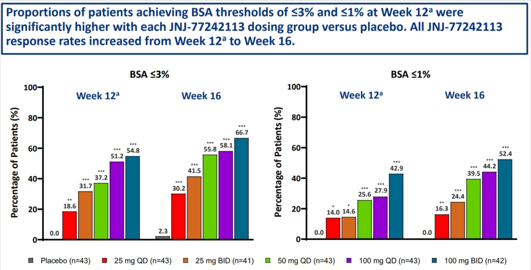 JNJ-77242113治疗组的PASI指数改善百分比明显高于安慰剂组,且达到PASI绝对阈值和BSA绝对阈值(治疗目标)的患者比例也明显增加并表现出剂量依赖性。
