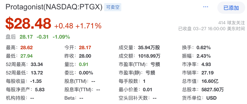 截止2024年3月27日,Protagonist Therapeutics公司(NASDAQ:PTGX)市值约16.6亿美元;每股价格为28.48美元。公司上市日期为2016年08月11日。最早成立于2006年。截止2024年8月20日,市值为24.45亿美元。