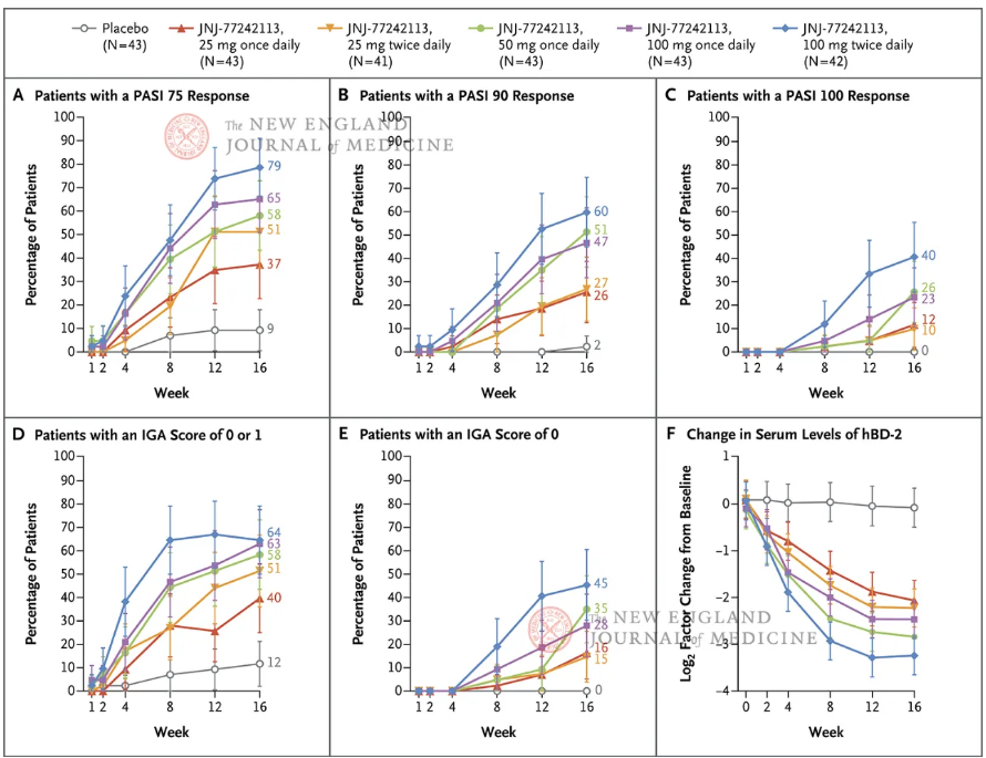 Methods:In this phase 2 dose-finding trial, we randomly assigned patients with moderate-to-severe plaque psoriasis to receive JNJ-77242113 at a dose of 25 mg once daily, 25 mg twice daily, 50 mg once daily, 100 mg once daily, or 100 mg twice daily or placebo for 16 weeks. The primary end point was a reduction from baseline of at least 75% in the Psoriasis Area and Severity Index (PASI) score (PASI 75 response; PASI scores range from 0 to 72, with higher scores indicating greater extent or severity of psoriasis) at week 16.