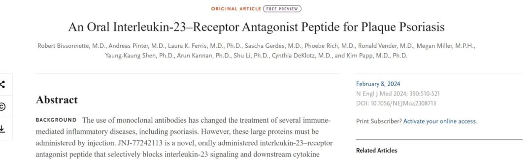 Bissonnette R, Pinter A, Ferris LK, et al. An Oral Interleukin-23–Receptor Antagonist Peptide for Plaque Psoriasis. N Engl J Med 2024; 390:510-21;https://pubmed.ncbi.nlm.nih.gov/38324484/;